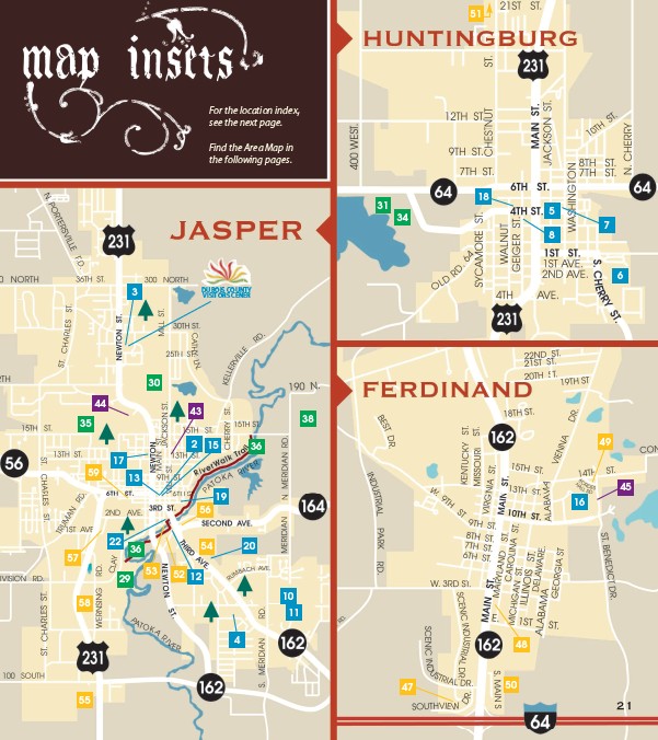 For the location index, see the next page. Find the Area Map in the following pages. 7 6 8 18 34 5 31 51 16 49 47 50 45 17 2 15 3 30 38 36 54 53 43 19 22 20 12 36 52 57 58 55 29 4 13 35 44 59 DUBOIS COUNTY VISITORS CENER 21 48 56 10 11