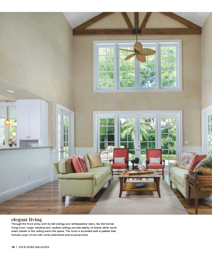 beam details in the ceiling warm the space. The room is accented with a palette that