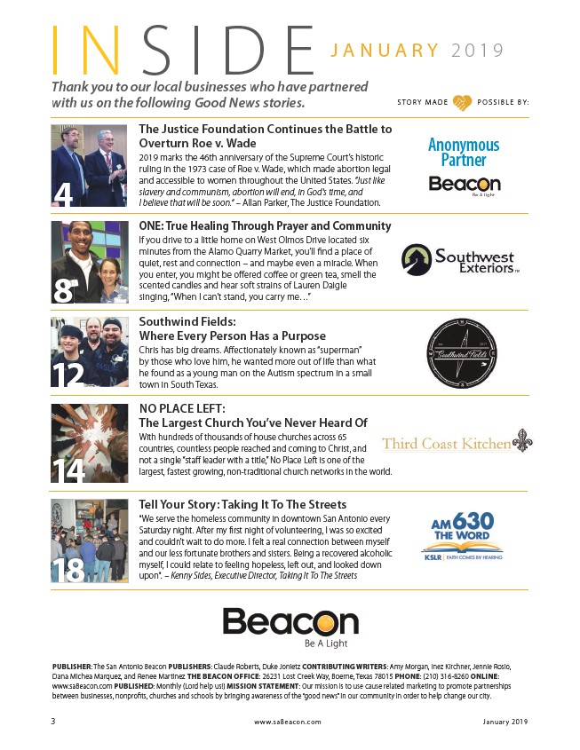PUBLISHER: The San Antonio Beacon PUBLISHERS: Claude Roberts, Duke Jonietz CONTRIBUTING WRITERS: Amy Morgan, Inez Kirchner, Jennie Rosio,
