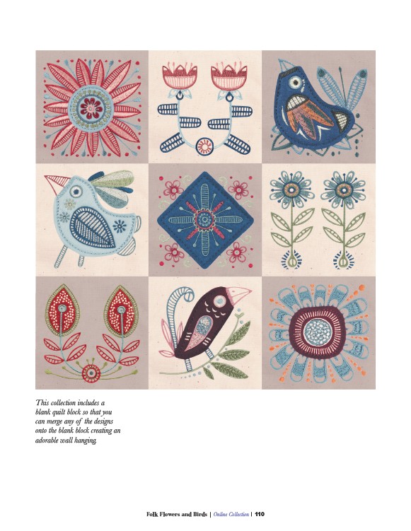 This collection includes a blank quilt block so that you can merge any of the designs onto the blank block creating an adorable wall hanging. Folk Flowers and Birds | Online Collection | 110
