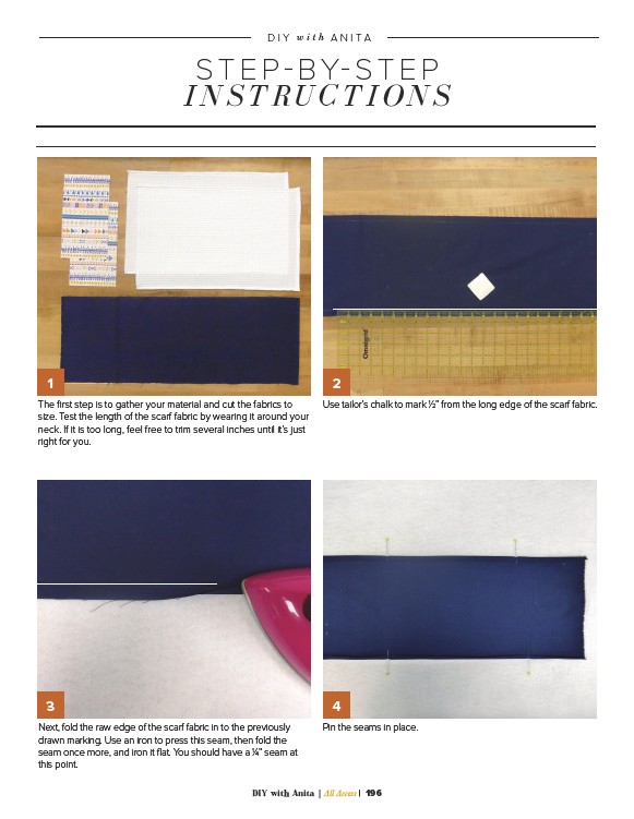 Use tailor’s chalk to mark 1⁄2” from the long edge of the scarf fabric.