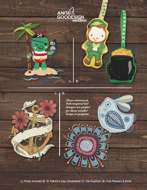 B. D. A. C. These whimsical, Folk-inspired 4x4 designs are perfect for those smaller hoops or projects! A. Pirate Animals| B. St. Patrick’s Day Ornaments | C. Ink Inspired | D. Folk Flowers & Birds