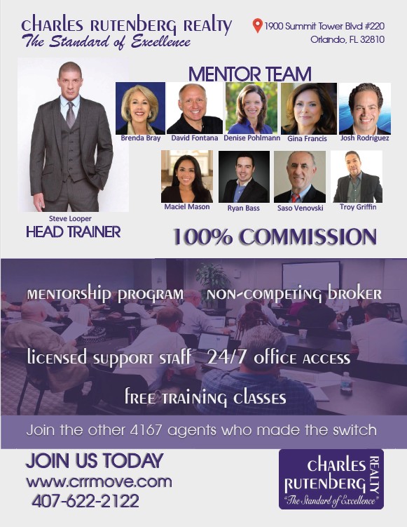 1900 Summit Tower Blvd #220 Orlando, FL 32810 MENTOR TEAM HEAD TRAINER Join the other 4167 agents who made the switch JOIN US TODAY www.crrmove.com 407-622-2122