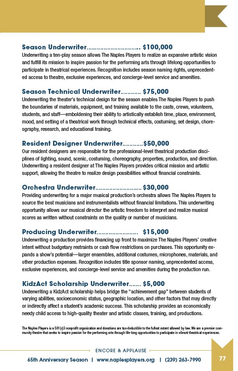 The Naples Players is a 501(c)3 nonprofit organization and donations are tax-deductible to the fullest extent allowed by law. We are a premier community