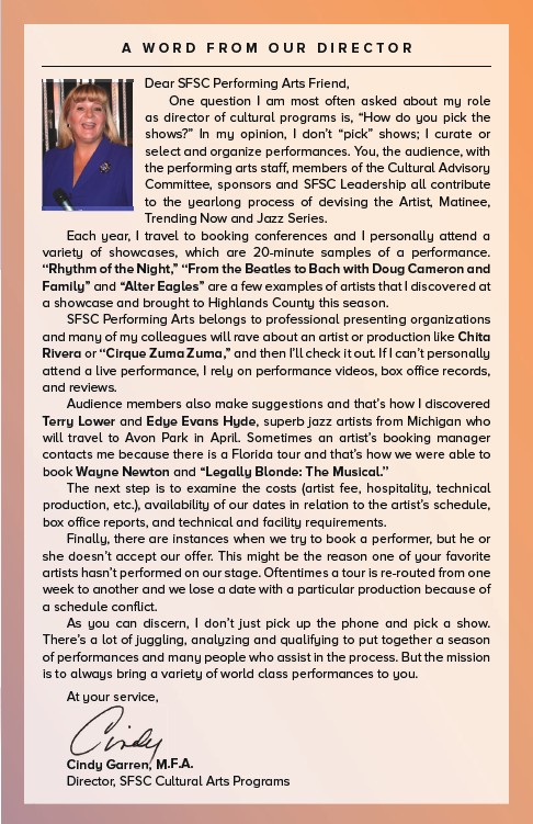 will travel to Avon Park in April. Sometimes an artist’s booking manager