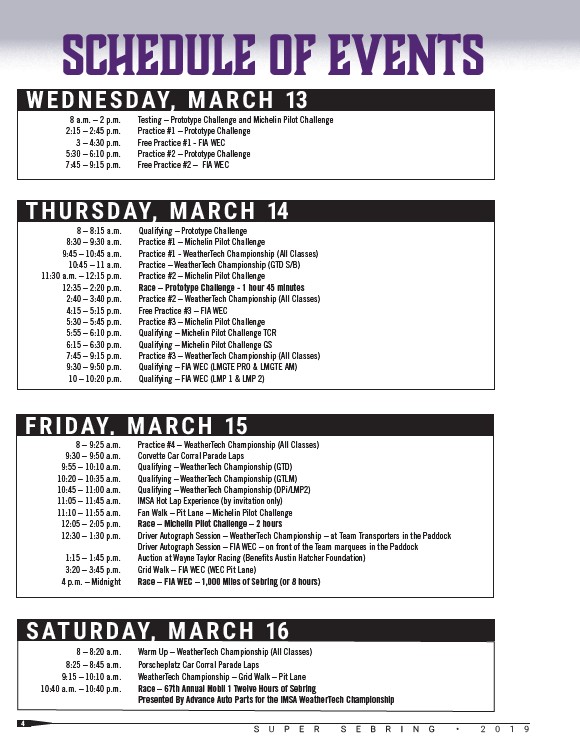 4 p.m. – Midnight Race – FIA WEC – 1,000 Miles of Sebring (or 8 hours)