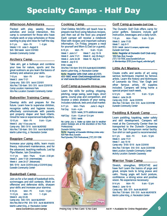 www.DunedinGov.com/camps Pricing Key: $ Rec Card / $ No Card Act #: = Available for Online Registration