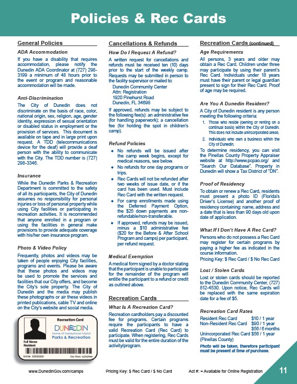 www.DunedinGov.com/camps Pricing Key: $ Rec Card / $ No Card Act #: = Available for Online Registration