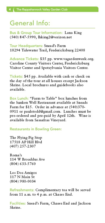 Advance Tickets: $35 pp. www.vagardenweek.org.