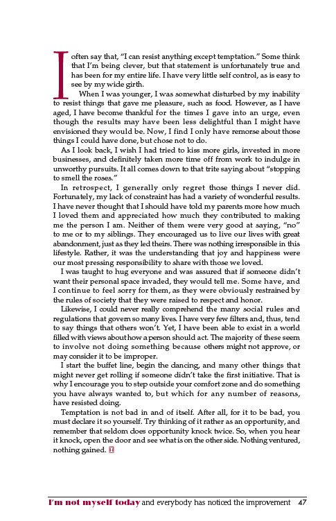 I often say that, “I can resist anything except temptation.” Some think