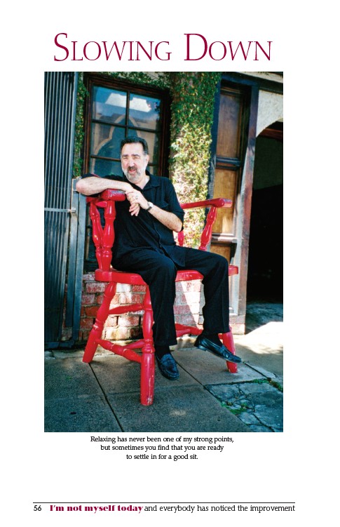 SLOWING DOWN Relaxing has never been one of my strong points, but sometimes you find that you are ready to settle in for a good sit. 56 I’m not myself today and everybody has noticed the improvement