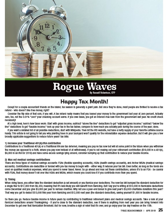 So there you go. Reduce taxable income in future years by contributing to traditional retirement plans and medical savings accounts. Take a look at your