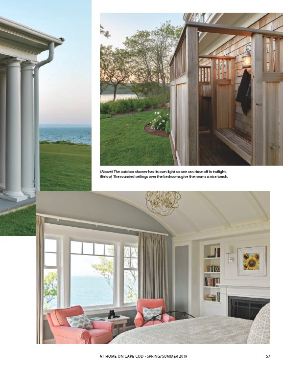 (Above) The outdoor shower has its own light so one can rinse off in twilight. (Below) The rounded ceilings over the bedrooms give the rooms a nice touch. AT HOME ON CAPE COD • SPRING/SUMMER 2019 57