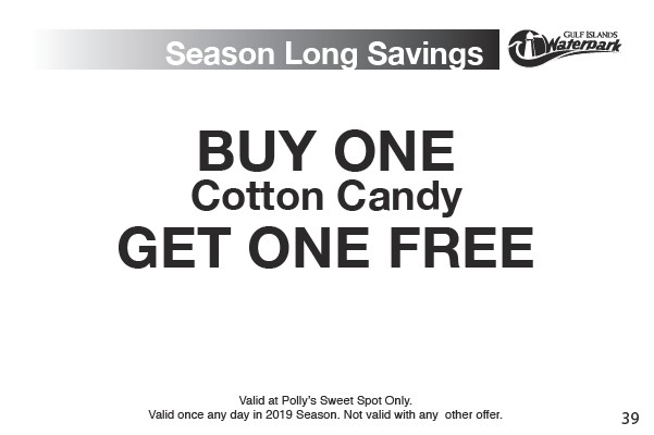 Season Long Savings BUY ONE Cotton Candy GET ONE FREE Valid at Polly’s Sweet Spot Only. Valid once any day in 2019 Season. Not valid with any other offer. 39