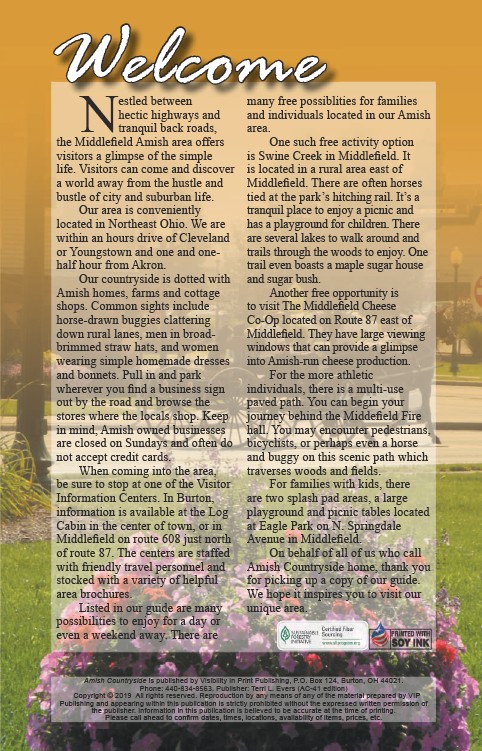 Amish Countryside is published by Visibility In Print Publishing, P.O. Box 124, Burton, OH 44021.
