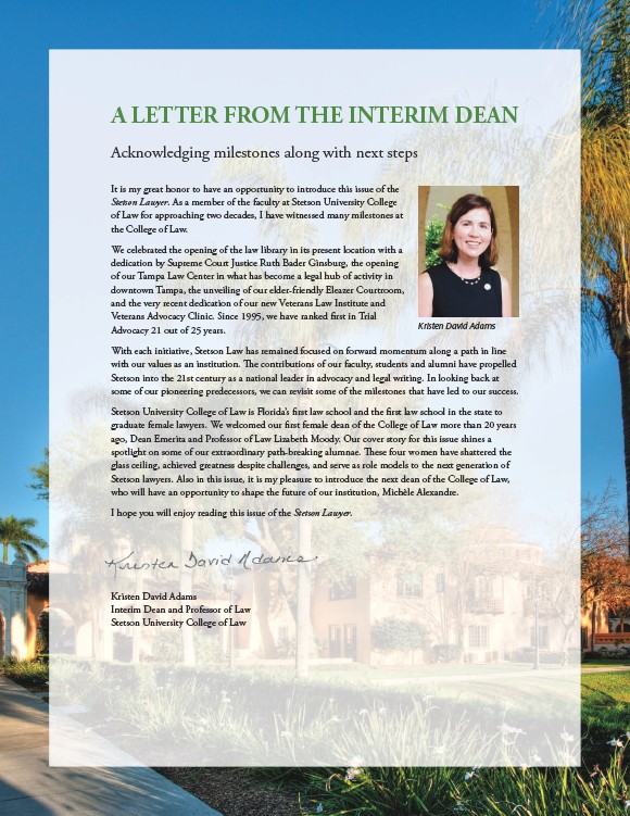 Stetson lawyers. Also in this issue, it is my pleasure to introduce the next dean of the College of Law,