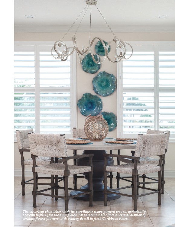 The silverleaf chandelier with its curvilinear wave pattern creates artistically