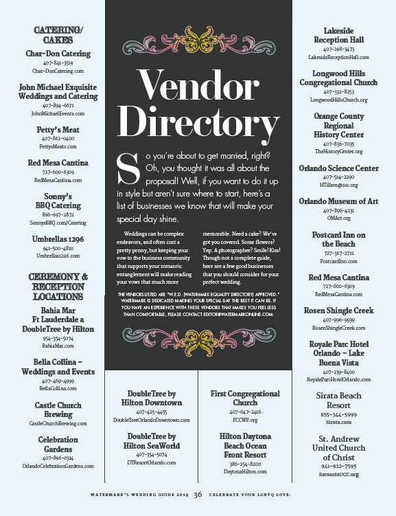 THE VENDORS LISTED ARE “W.E.D. (WATERMARK EQUALITY DIRECTORY) APPROVED.”