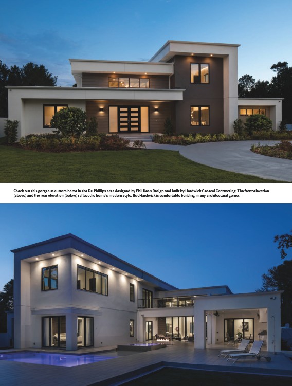 (above) and the rear elevation (below) reflect the home’s modern style. But Hardwick is comfortable building in any architectural genre.