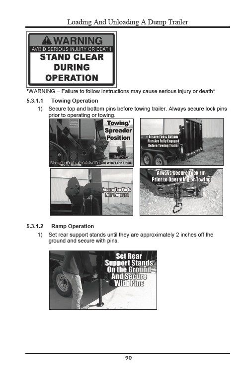 1) Secure top and bottom pins before towing trailer. Always secure lock pins