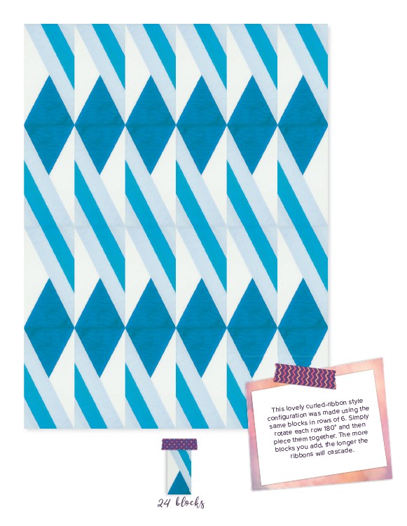 This lovely curled-ribbon style configuration was made using the same blocks in rows of 6. Simply rotate each row 180° and then piece them together. The more blocks you add, the longer the ribbons will cascade. 24 blocks