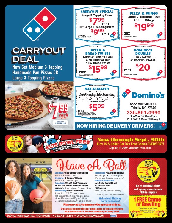 Any delivery charge is not a tip paid to your driver. Drivers carry less charge and tax may apply. Prices, participation, delivery area and charges electronically presented to your bank. ©2018 Domino’s IP Holder LLC. Domino’s0ODD8691_0ODD8691_BTM.indd 1 8532 CARRYOUT SPECIAL