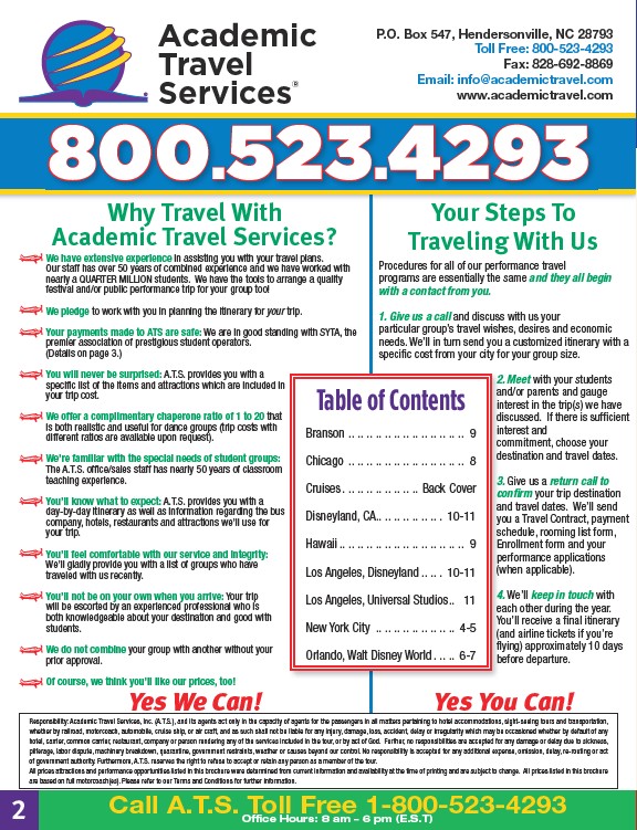 Responsibility: Academic Travel Services, Inc. (A.T.S.), and its agents act only in the capacity of agents for the passengers in all matters pertaining to hotel accommodations, sight-seeing tours and transportation,