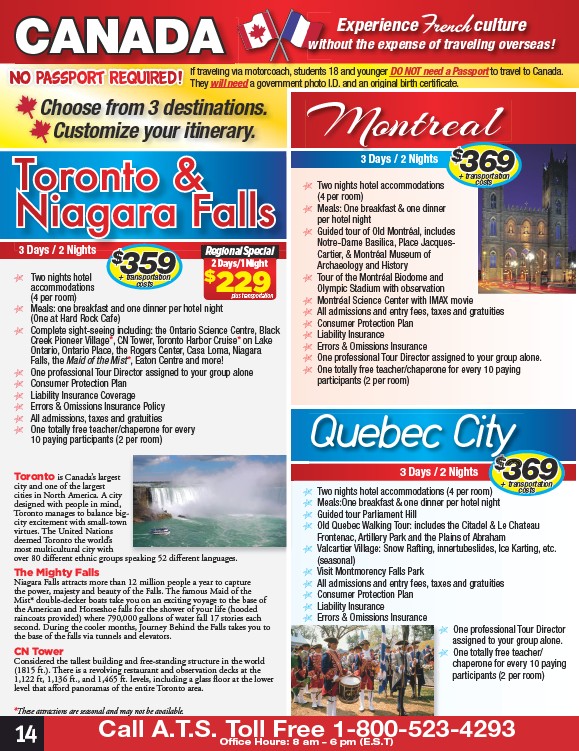NO Passport Required! If traveling via motorcoach, students 18 and younger DO NOT need a Passport to travel to Canada.