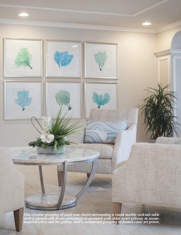 colors and the gallery wall’s customized grouping of framed coral art prints.