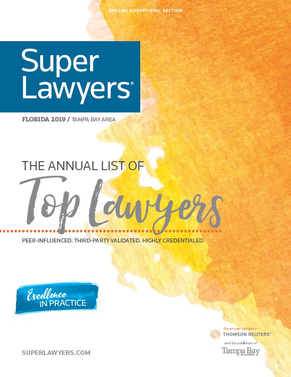 THE Top ANNUAL Lawyers LIST OF PEER-INFLUENCED. THIRD-PARTY VALIDATED. HIGHLY CREDENTIALED. JULY/AUGUST 2019 | TAMPA BAY MAGAZINE 39 FLORIDA 2019 / TAMPA BAY AREA Excell ence IN PRACTICE SUPERLAWYERS.COM SPECIAL ADVERTISING SECTION