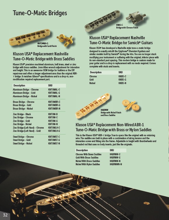 Kluson USA® has developed a Nashville style tune-o-matic bridge