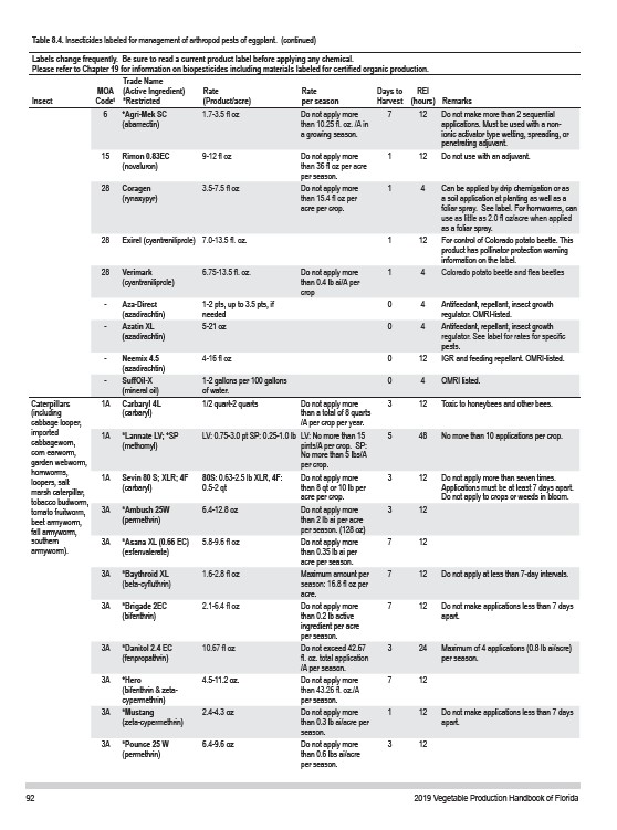 Table 8.4. Insecticides labeled for management of arthropod pests of eggplant. (continued)