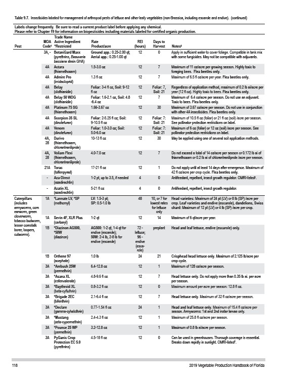 Table 9.7. Insecticides labeled for management of arthropod pests of lettuce and other leafy vegetables (non-Brassica, including escarole and endive). (continued)