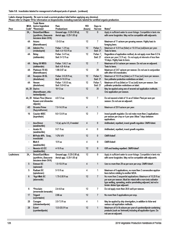 Table 9.8. Insecticides labeled for management of arthropod pests of spinach. (continued)