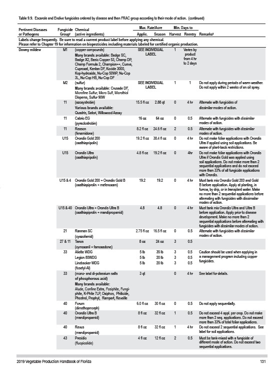 Table 9.9. Escarole and Endive fungicides ordered by disease and then FRAC group according to their mode of action. (continued)