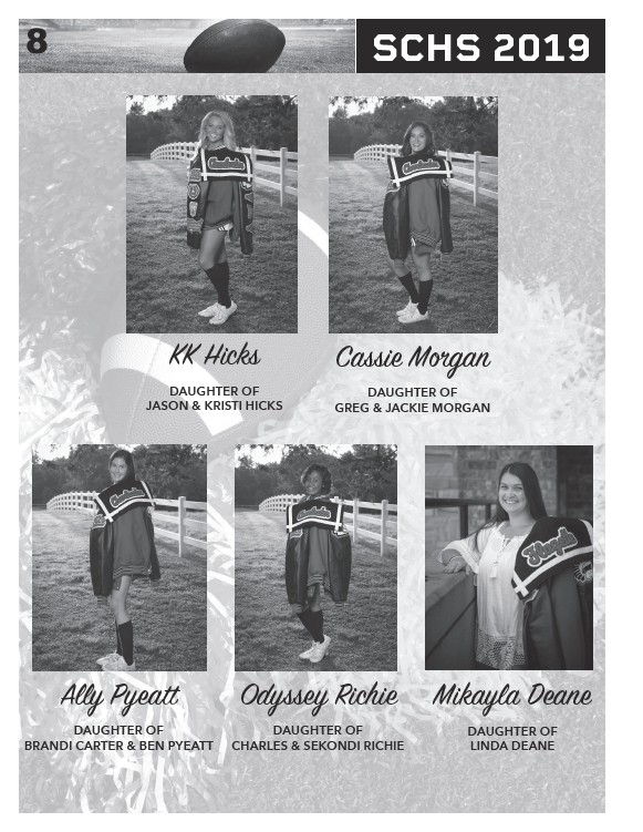 8 SCHS 2019 KK Hicks DAUGHTER OF JASON & KRISTI HICKS Ally Pyeatt DAUGHTER OF BRANDI CARTER & BEN PYEATT Cassie Morgan DAUGHTER OF GREG & JACKIE MORGAN Odyssey Richie DAUGHTER OF CHARLES & SEKONDI RICHIE Mikayla Deane DAUGHTER OF LINDA DEANE