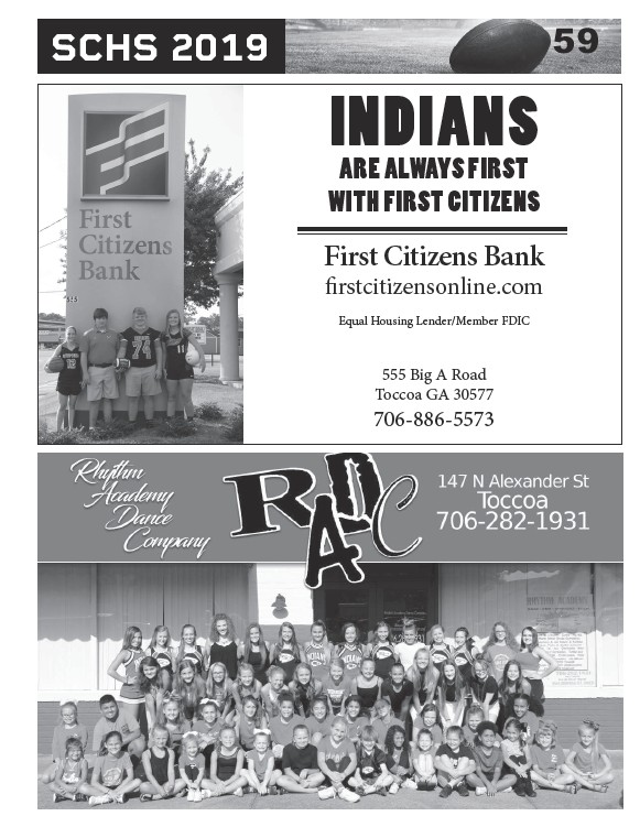 SCHS 2019 59 INDIANS ARE ALWAYS FIRST WITH FIRST CITIZENS First Citizens Bank firstcitizensonline.com Equal Housing Lender/Member FDIC 555 Big A Road Toccoa GA 30577 706-886-5573