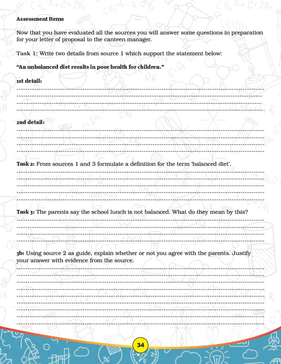34 Assessment Items “An unbalanced diet results in poor health for children.” 1st detail: 2nd detail: Task 2: Task 3: 3b: