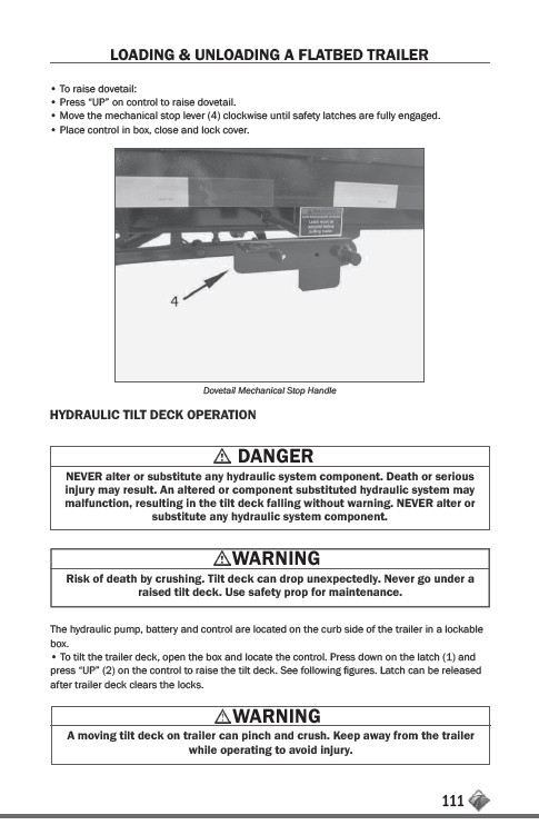 A moving tilt deck on trailer can pinch and crush. Keep away from the trailer