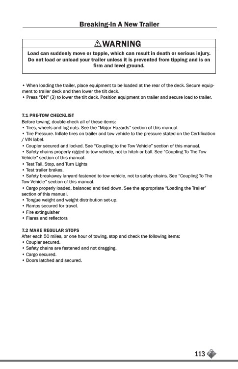 • Cargo properly loaded, balanced and tied down. See the appropriate “Loading the Trailer”