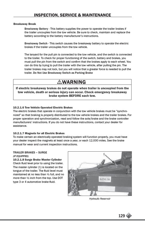 tow vehicle, death or serious injury can occur. Check emergency breakaway