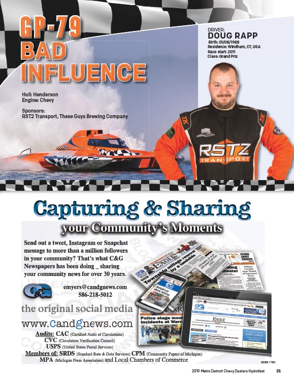 DRIVER: DOUG RAPP Birth: 01/08/1988 Residence: Windham, CT, USA Race start: 2011 Class: Grand Prix Hull: Henderson Engine: Chevy Sponsors: RST2 Transport, These Guys Brewing Company 2019 Metro Detroit Chevy Dealers Hydrofest
