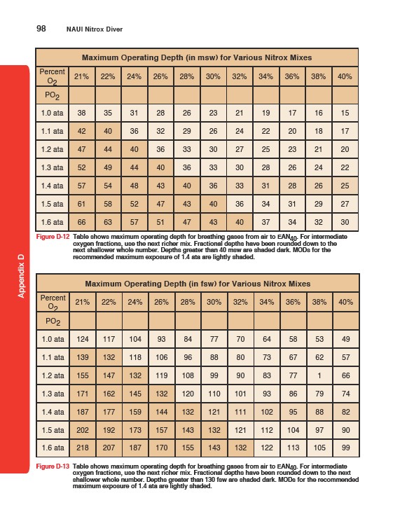 Figure D-12 Table shows maximum operating depth for breathing gases from air to EAN40. For intermediate