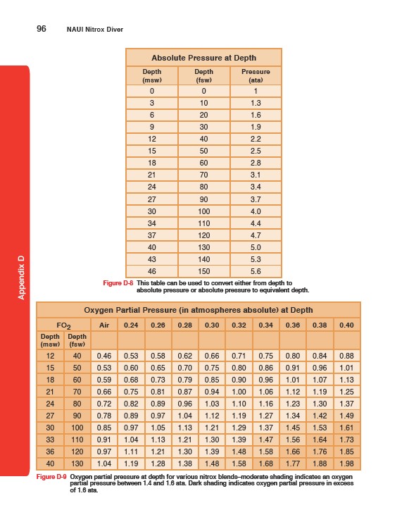Figure D-9 Oxygen partial pressure at depth for various nitrox blends–moderate shading indicates an oxygen