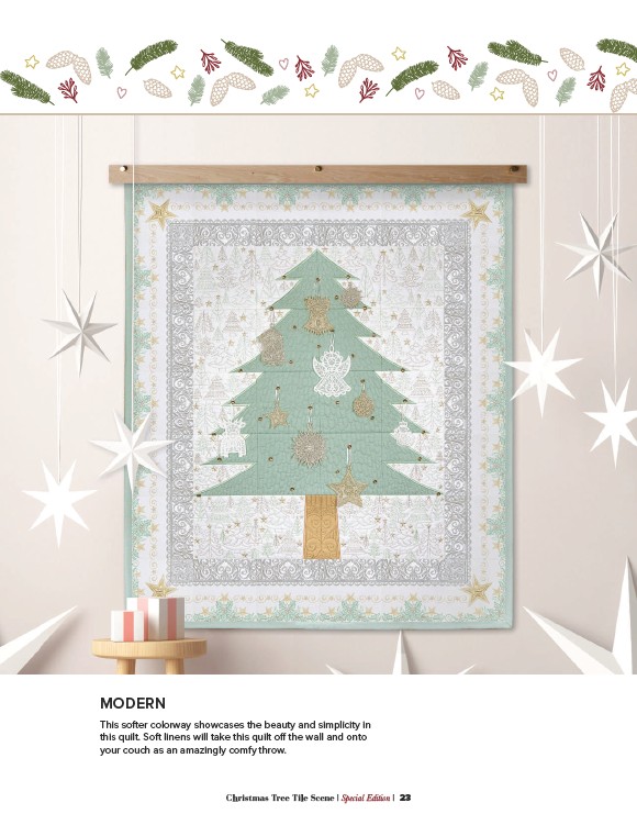 This softer colorway showcases the beauty and simplicity in this quilt. Soft linens will take this quilt off the wall and onto your couch as an amazingly comfy throw. Christmas Tree Tile Scene | Special Edition | 23 MODERN