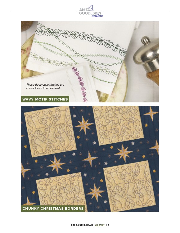 RELEASE RADAR | ALL ACCESS | 6 These decorative stitches are a nice touch to any linens! WAVY MOTIF STITCHES CHUNKY CHRISTMAS BORDERS