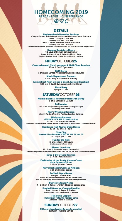Hall of Distinguished Alumni, Honored Classes: 1969, ’94, ’09, ’14, ‘19 & Special Entertainment.