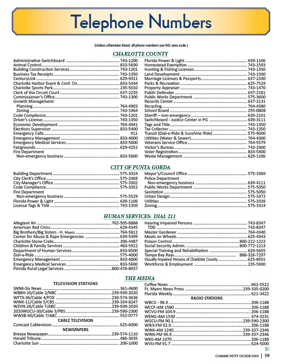 (Unless otherwise listed, all phone numbers use 941 area code.)