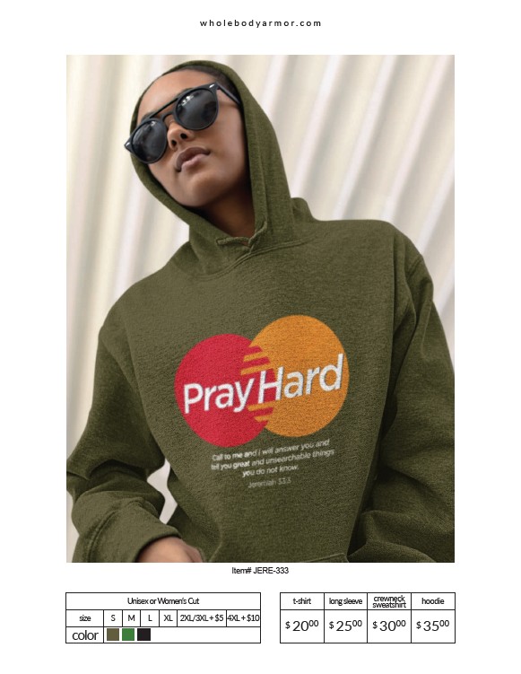 size Unisex or Women’s Cut color w h o l e b o d y a r m o r. com Item# JERE-333 S M L XL 4XL + $10 t-shirt long sleeve crewneck sweatshirt hoodie 2XL/3XL + $5 $2000 $2500 $3000 $3500