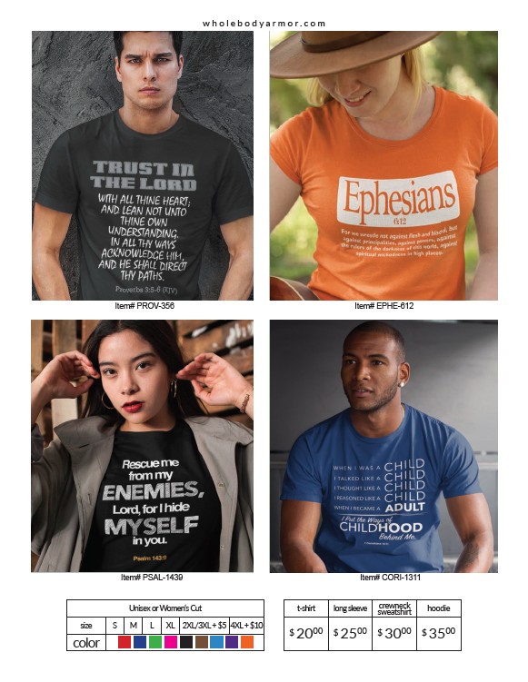 w h o l e b o d y a r m o r. com Item# PROV-356 Item# EPHE-612 Item# PSAL-1439 size Unisex or Women’s Cut color S M L XL 4XL + $10 Item# CORI-1311 t-shirt long sleeve crewneck sweatshirt hoodie 2XL/3XL + $5 $2000 $2500 $3000 $3500